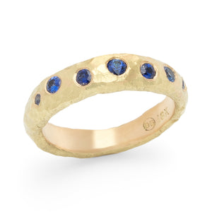 Narrow hand-hammered gold band with eroded edges, organically varies in width from 3.5-4.5mm. Wear it all day every day, the texture gains character when worn over time. 18k yellow gold, Size 6. Contact us about adding gemstones of your choice.